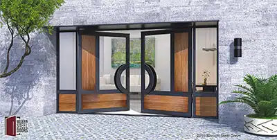 Steel is synthetic and provides the structure needed for longevity. Our steel doors are most often powder-coated a version of black because of black's universal match ability. Black steel also provides the best contrast with all wood species. Black powder coating is available in hammered, matte, semigloss, and subtle metallic. Steel ensures that your steel wooden door will not bow, twist, or warp. These are common problems associated with exterior wood doors.